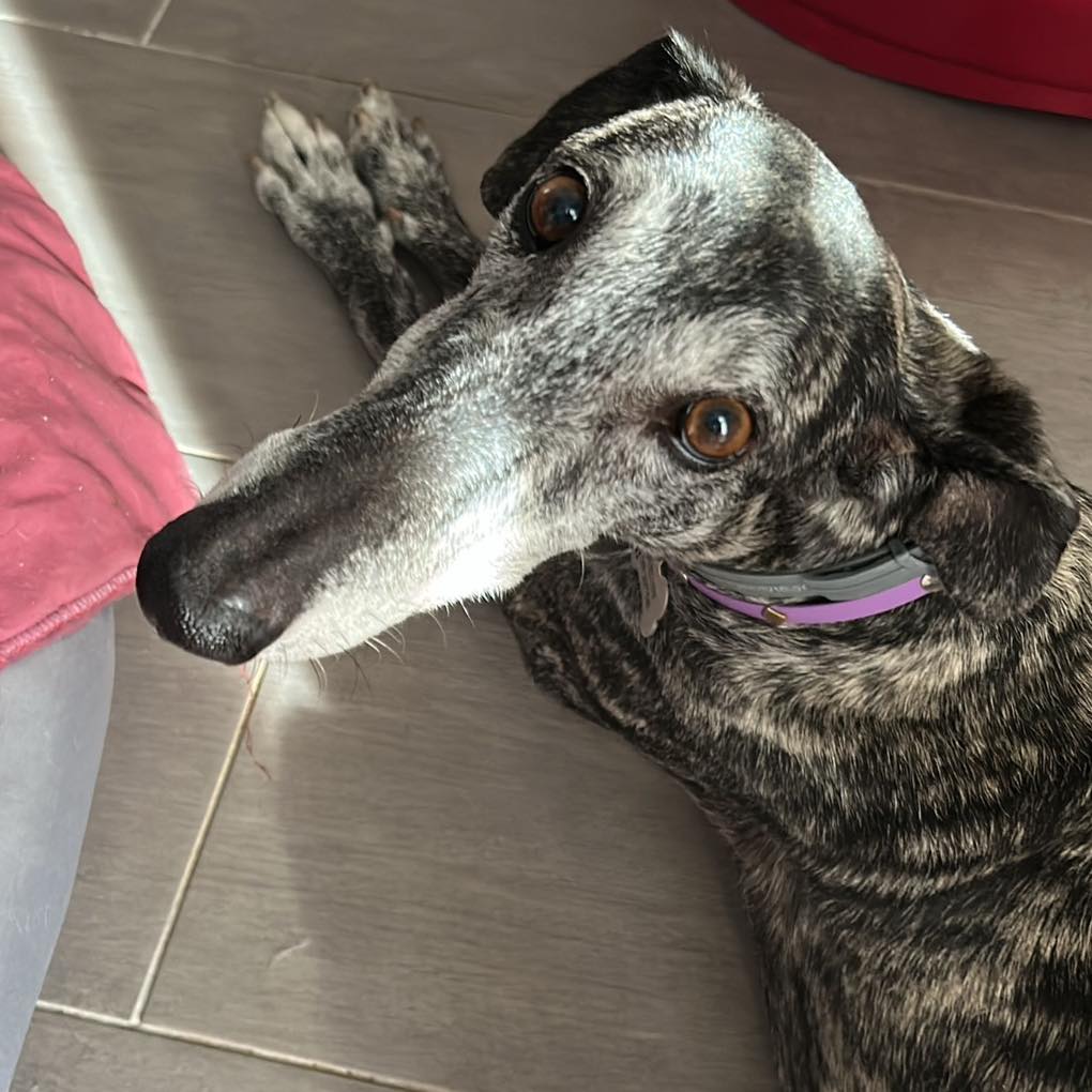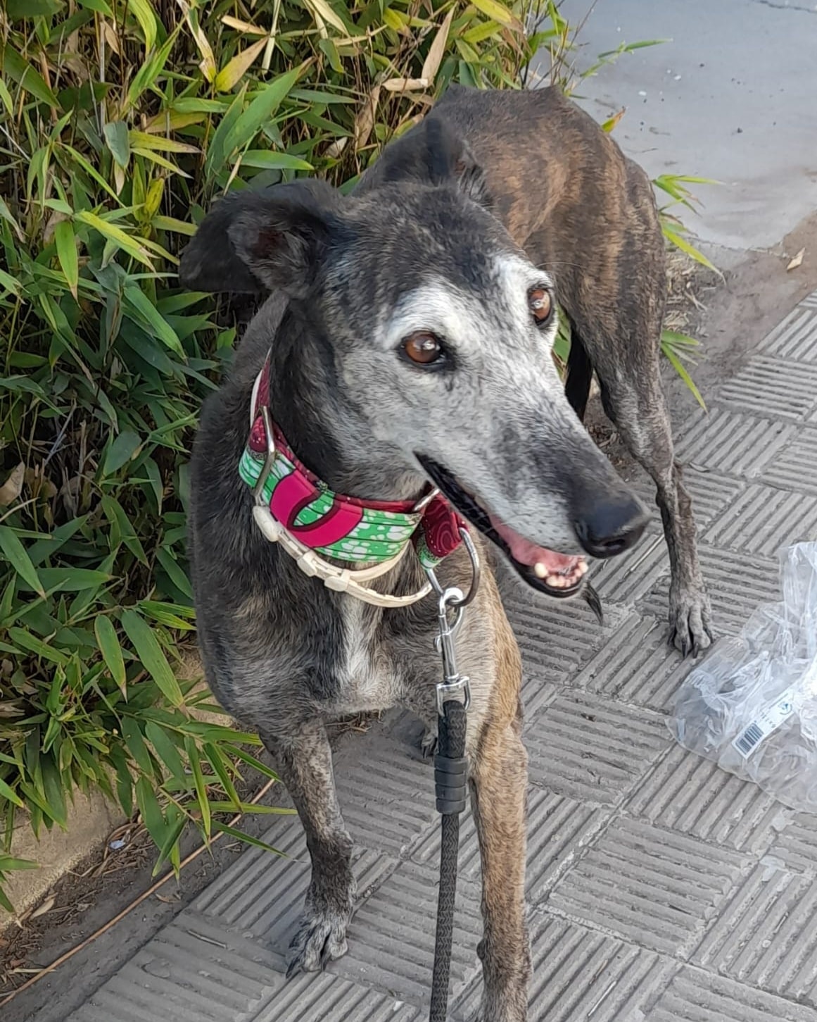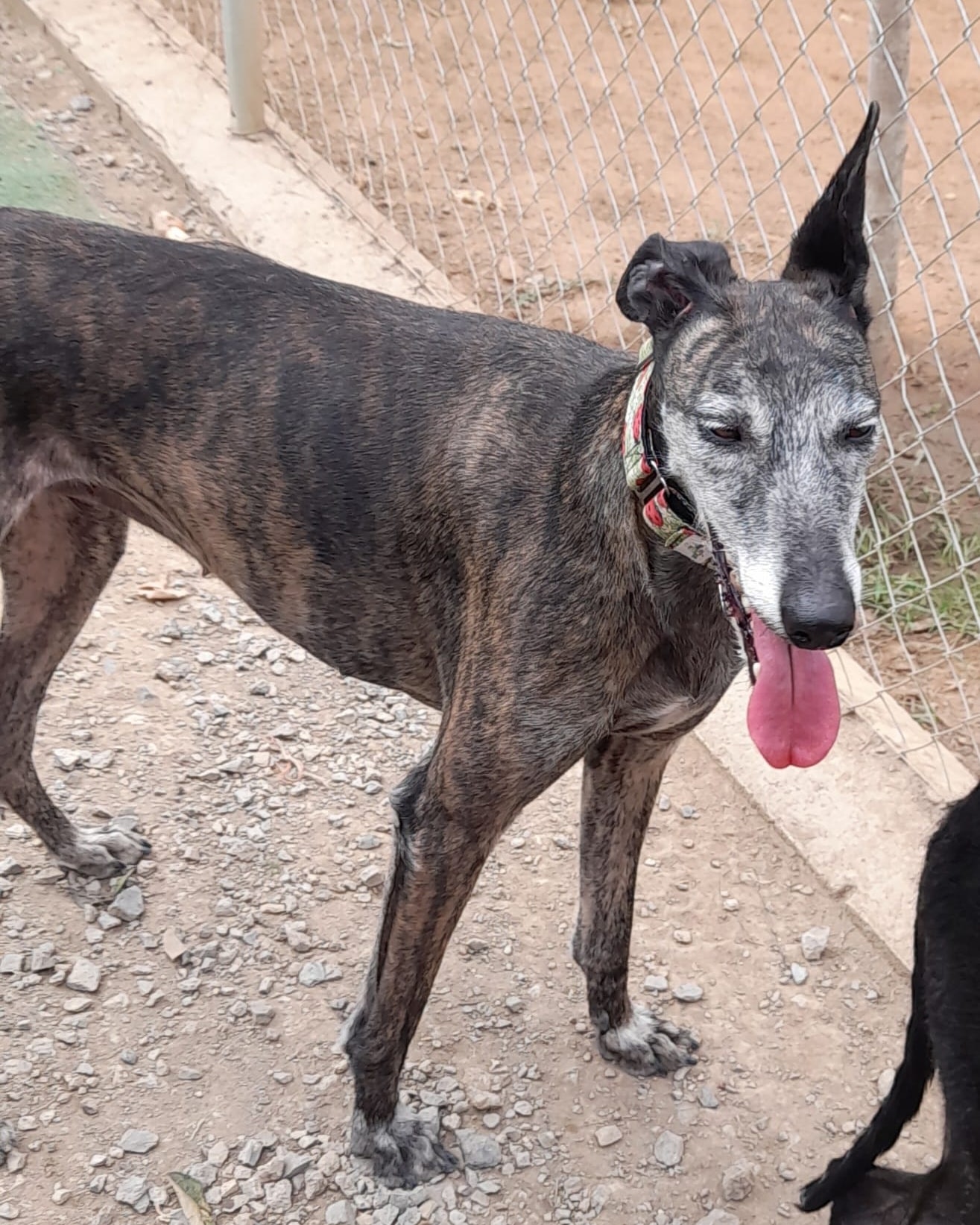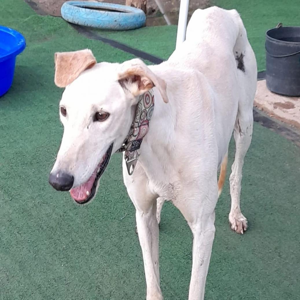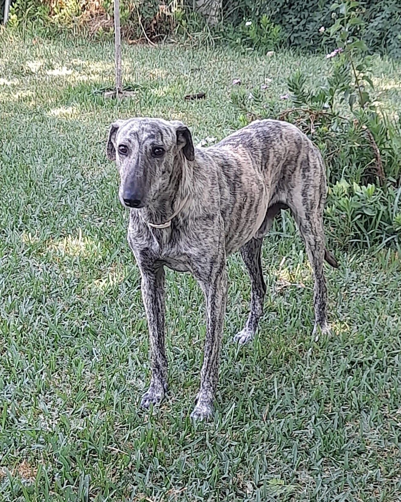 Levriera spagnola di taglia grande, un poco timida all’inizio ma appena conosce è un’amore.